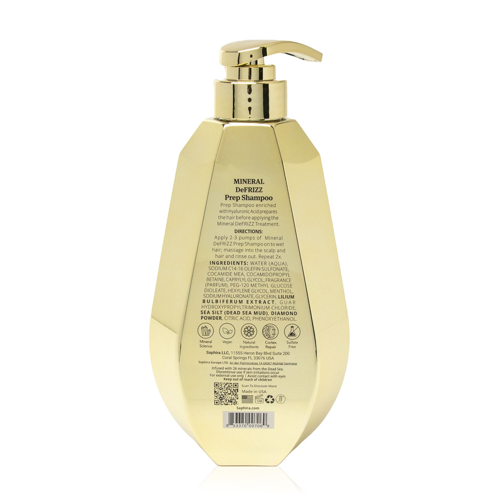 The Prep Shampoo is a clairifying essential first step for the Saphira Salon Service Mineral DeFRIZZ Treatment. Enriched with Hyaluronic Acid, Diamond Powder, and 26 active minerals, it gently clarifies and purifies the hair, perfectly preparing it for the salon service DeFrizz Treatment to follow.